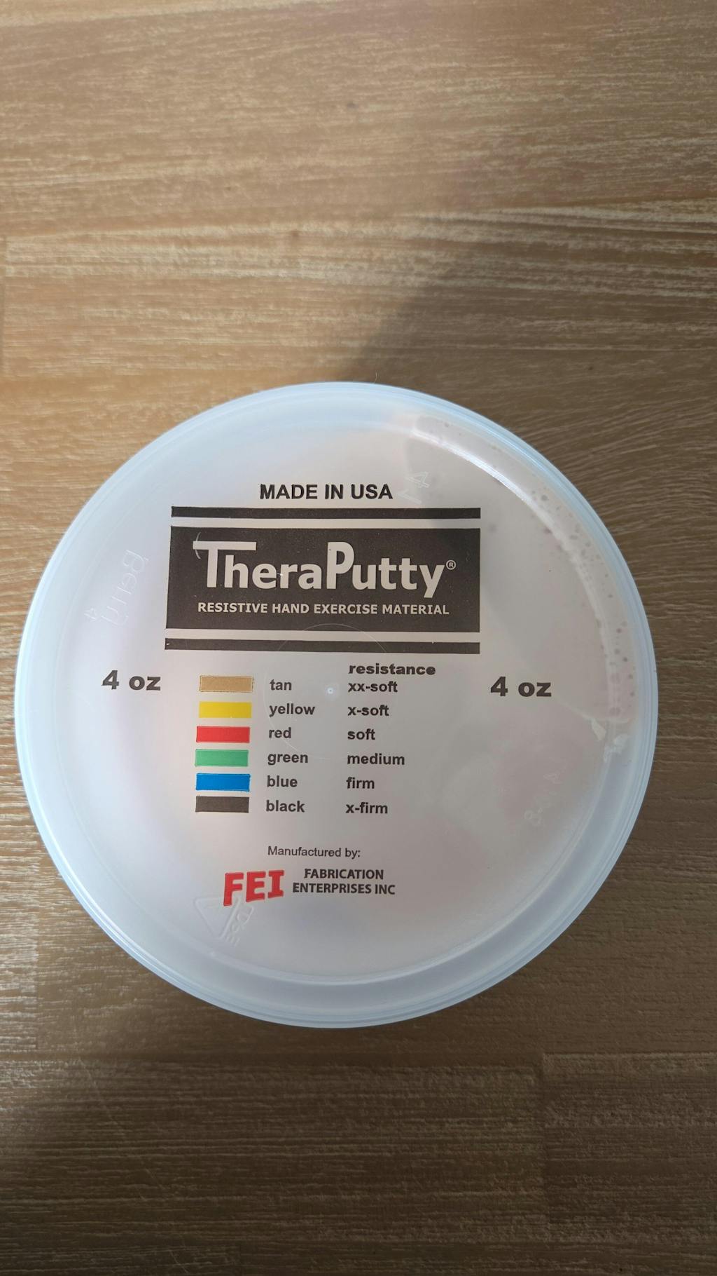 This set of scented Theraputty is graded from xx soft to medium strength. The added bonus is that the putty smells great! Each set of 4 contains the following: Tan (vanilla) xx soft, Yellow (banana) x soft, Red (cherry) soft, and Green (apple) medium. Each pot of putty weighs approximately 56 grams.